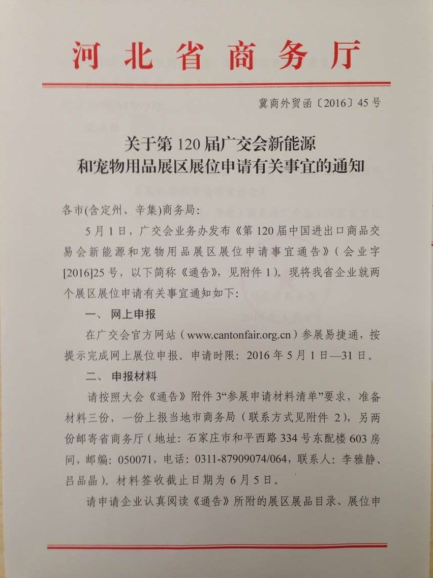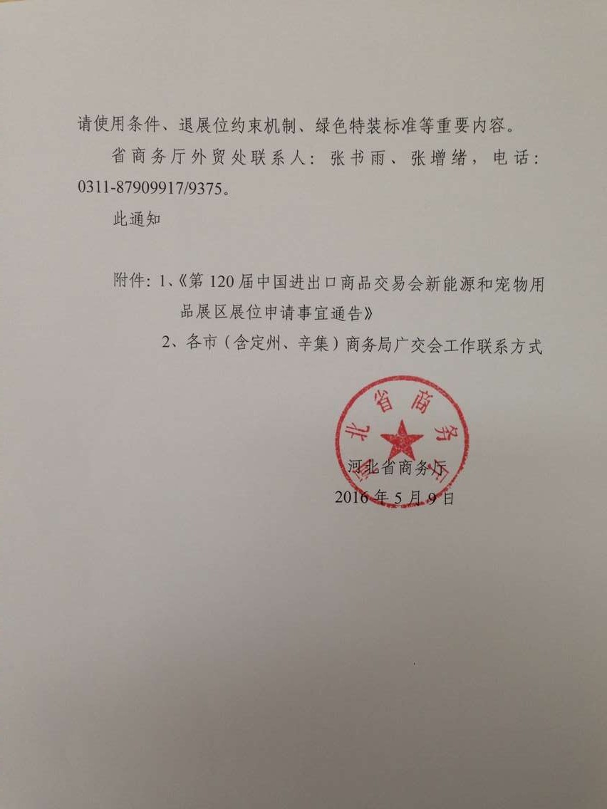 关于第120届广交会新能源和宠物用品展区展位申请有关事宜的通知扫描件