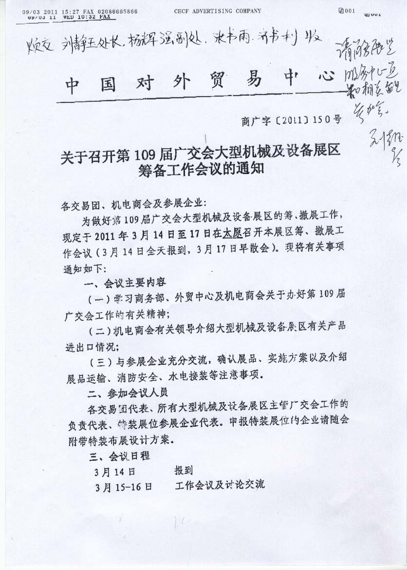转发《关于召开109届广交会大型机械及设备展区筹备工作会议的通知》