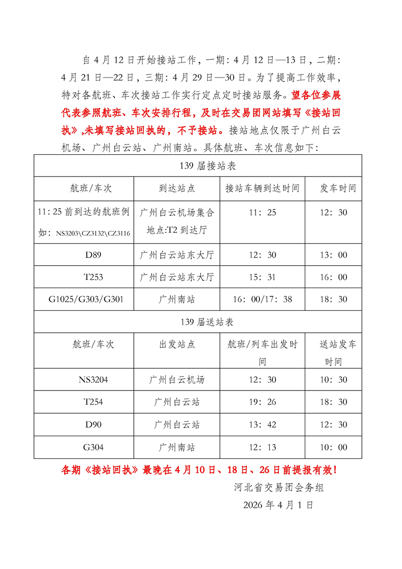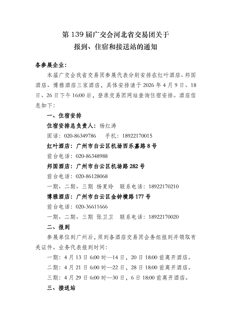 第139届广交会河北省交易团关于报到、住宿和接送站的通知